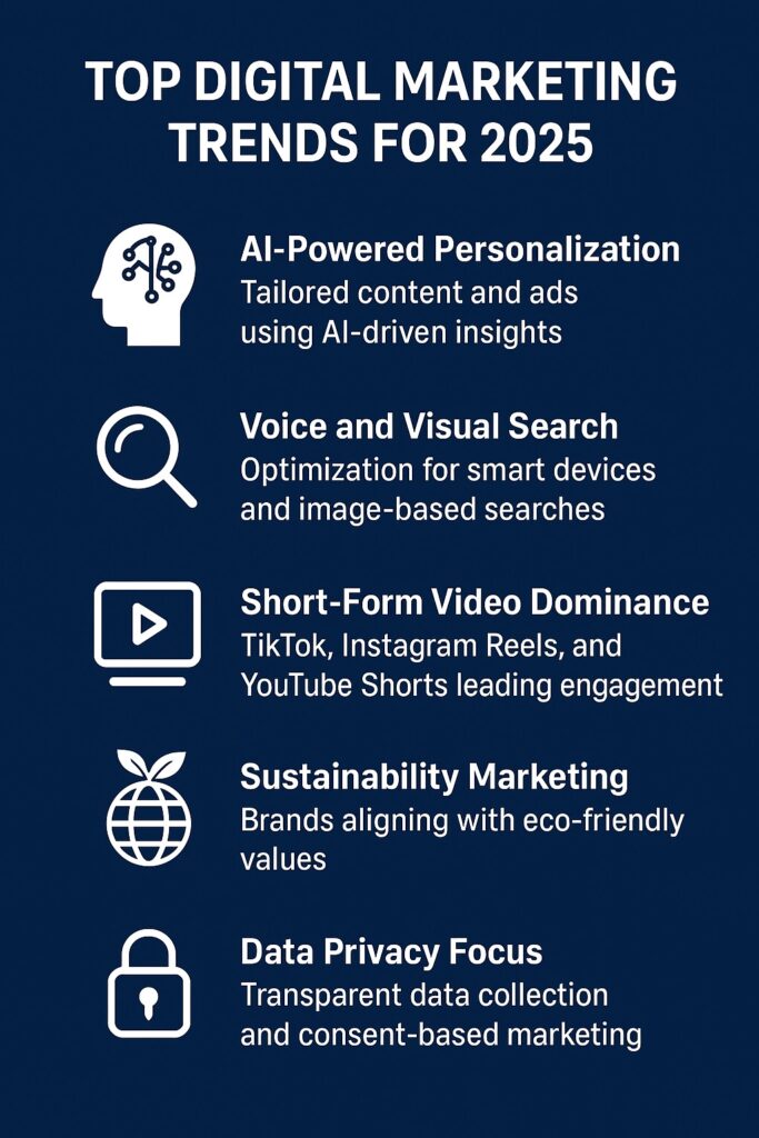 The digital marketing landscape in 2025 is defined by innovation, personalization, and transparency. As AI transforms how content is delivered, and voice and visual search reshape discovery, marketers must stay agile and forward-thinking. Short-form video will continue to dominate engagement, while sustainability and data privacy will define brand trust and reputation.